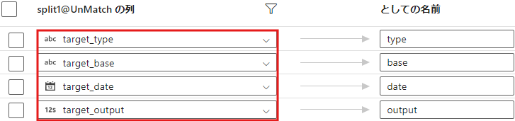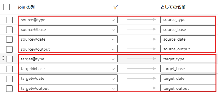 - 選択 アクティビティを使用して、それぞれtargetの列なのか、sourceの列なのかがわかるように変更します。