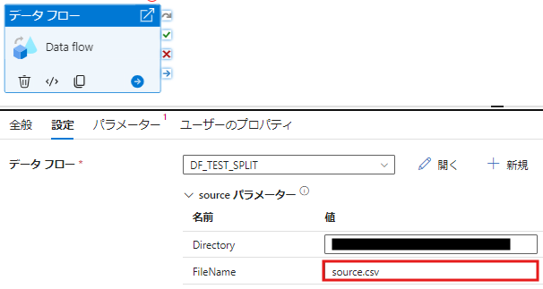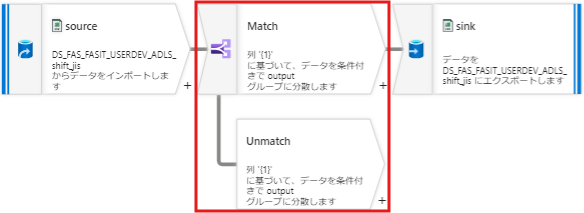 - データフロー内で条件分割アクティビティを追加し、source.csv を分割します。